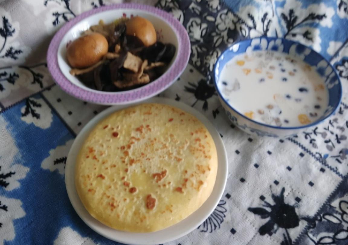 (4)锅中放入一勺面糊,烙制两面微黄,早餐饼就好了。